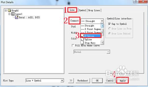 6、在散点图的基础上获得趋势线。如果想获得的不是折线图,而是希望用平滑的曲线表示趋势,则只需在折线基础上进一步加工如下:“双击折线”—“选择Line”------“connect”----- “选择曲线类型”----“Apply”。