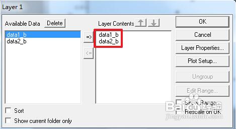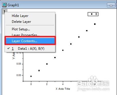10、在一个坐标上绘制多条曲线。得到第一个图形的拟合曲线,在坐标的左上角处有一个“1”,右击选择“Layer contents”,打开对话框以后在左栏选中你要添加到该图的数据表。